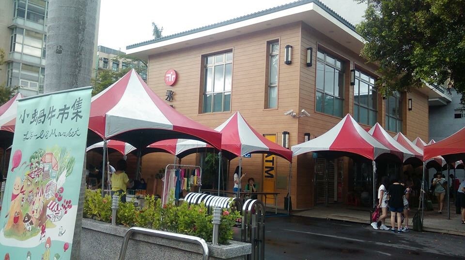 興大舊應經二館C棟去年在興大與永豐銀的產學合作計畫推動下,改造為永豐銀興大分行, 以木屋造型融合週邊自然景觀。 分行二樓「永豐興藝廊」同步展出在興大藝術中心展覽的藝術家作品。 小蝸牛市集在審計新村施工期間也使用永豐銀前的廣場擺攤。