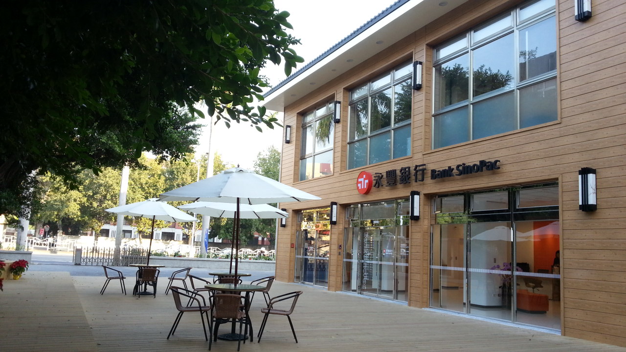 興大應經二館C棟位於國光路上近興大路口,建物興建至今已近50年歷史,永豐銀興大分行與興大產學合作,進行建物結構補強,同時延伸興大綠園道串聯綠地,拆除圍牆,舖設木棧道,認養前方綠地,設計時特別融合週邊自然景觀,將原本的水泥建物裝潢為木屋造型。分行緊鄰學生通往女宿必經的地下道,木屋外燈開燈至晚間12點,也讓學生返宿之路更安全明亮。