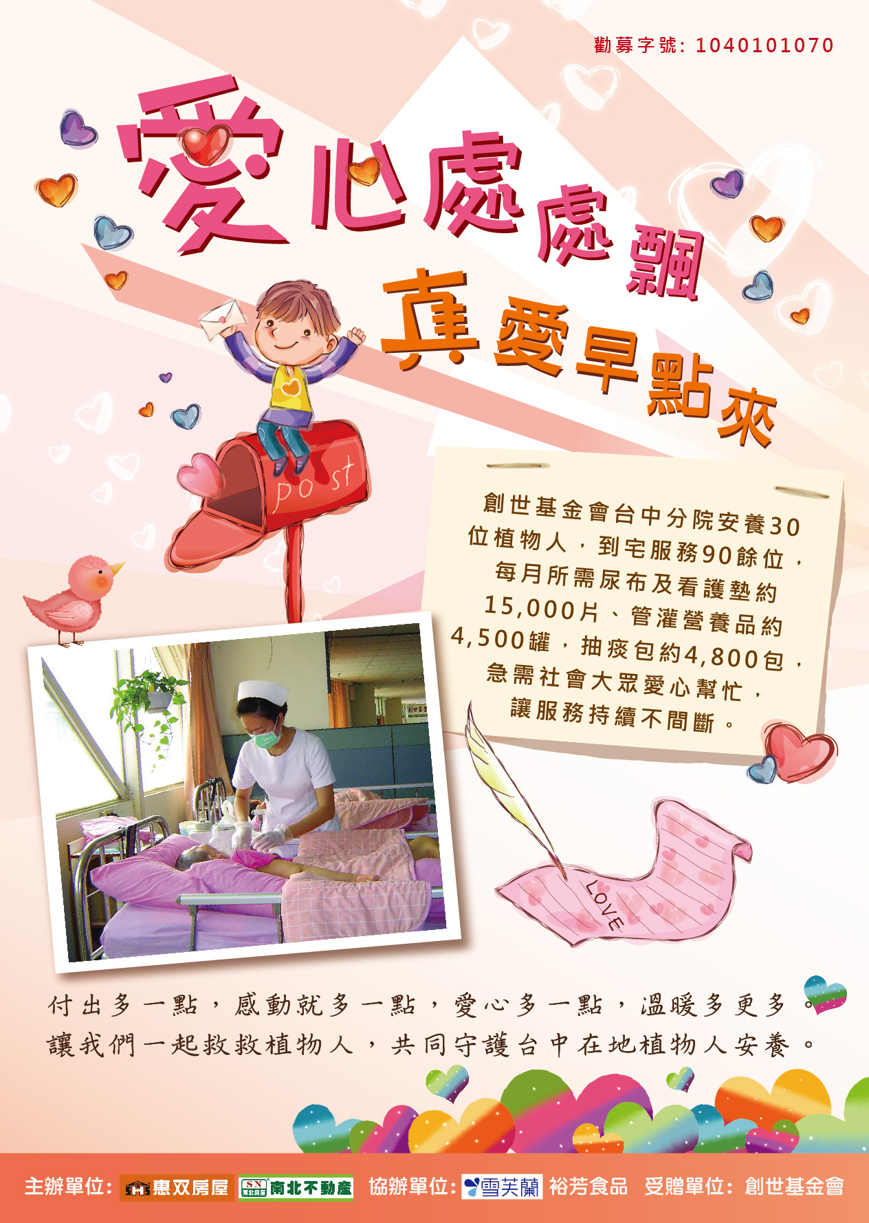 為幫助弱勢分享公益,回饋鄉里為己任,認同「救一位植物人等於救一個家庭」的理念,期望各界發揮鄉親救鄉親的力量,支持植物人安養,將善良風氣溫暖台灣各角落。期盼將更多的愛心與溫暖幫助植物人安養衛材,如管灌奶粉、營養品、尿布、看護墊、抽痰包、復健硬體設施..等。