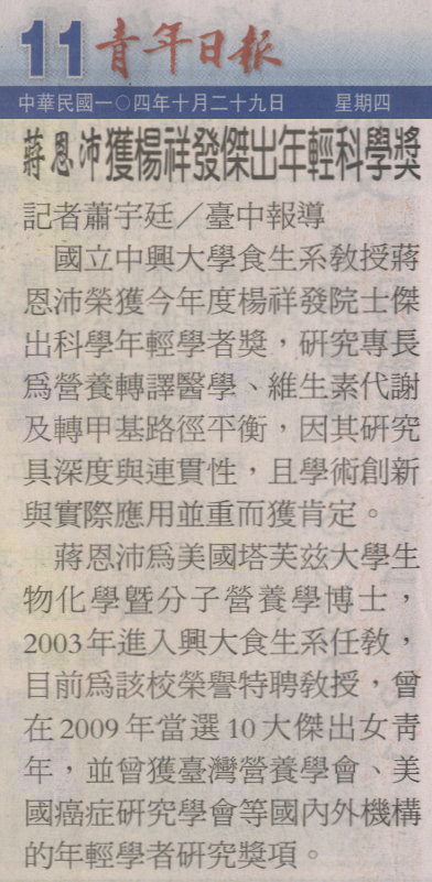 【媒體報導】蔣恩沛獲楊祥發傑出年輕科學獎