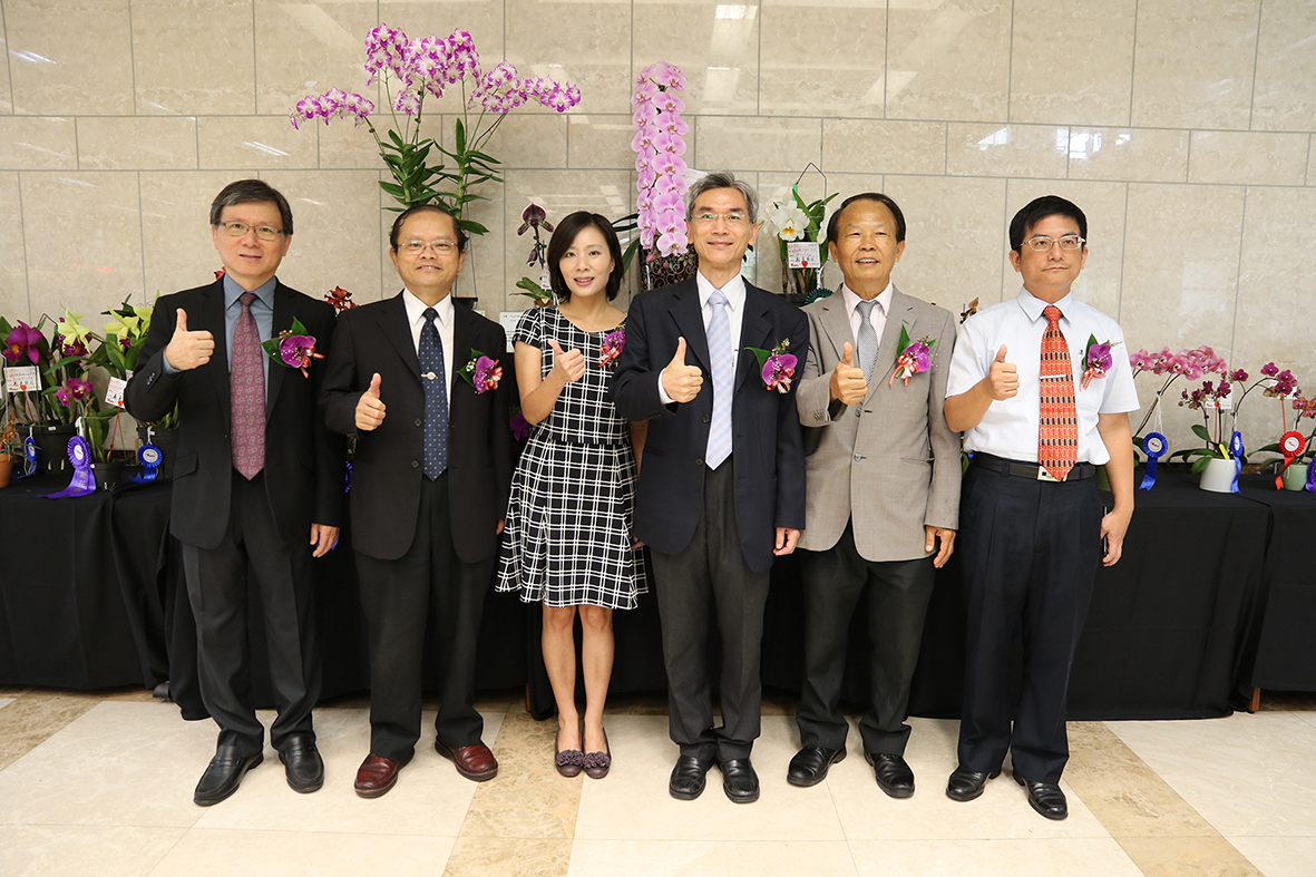 「第六屆菁育獎頒獎典禮暨蘭花展」10月29日上午在中興大學圖書館1樓舉辦開幕剪綵,展期至11月1日,各式蘭花爭奇鬥豔。【活動相簿】 興大薛富盛校長(右3)、張天傑副校長(左2)、林丙輝副校長(左1)、洪慧芝副研發長(左3)與臺灣蘭花育種者協會理事長賴本智(右2)共同參與開幕式。 蘭展評審執行長黃玉山介紹全場總冠軍蝴蝶蘭。