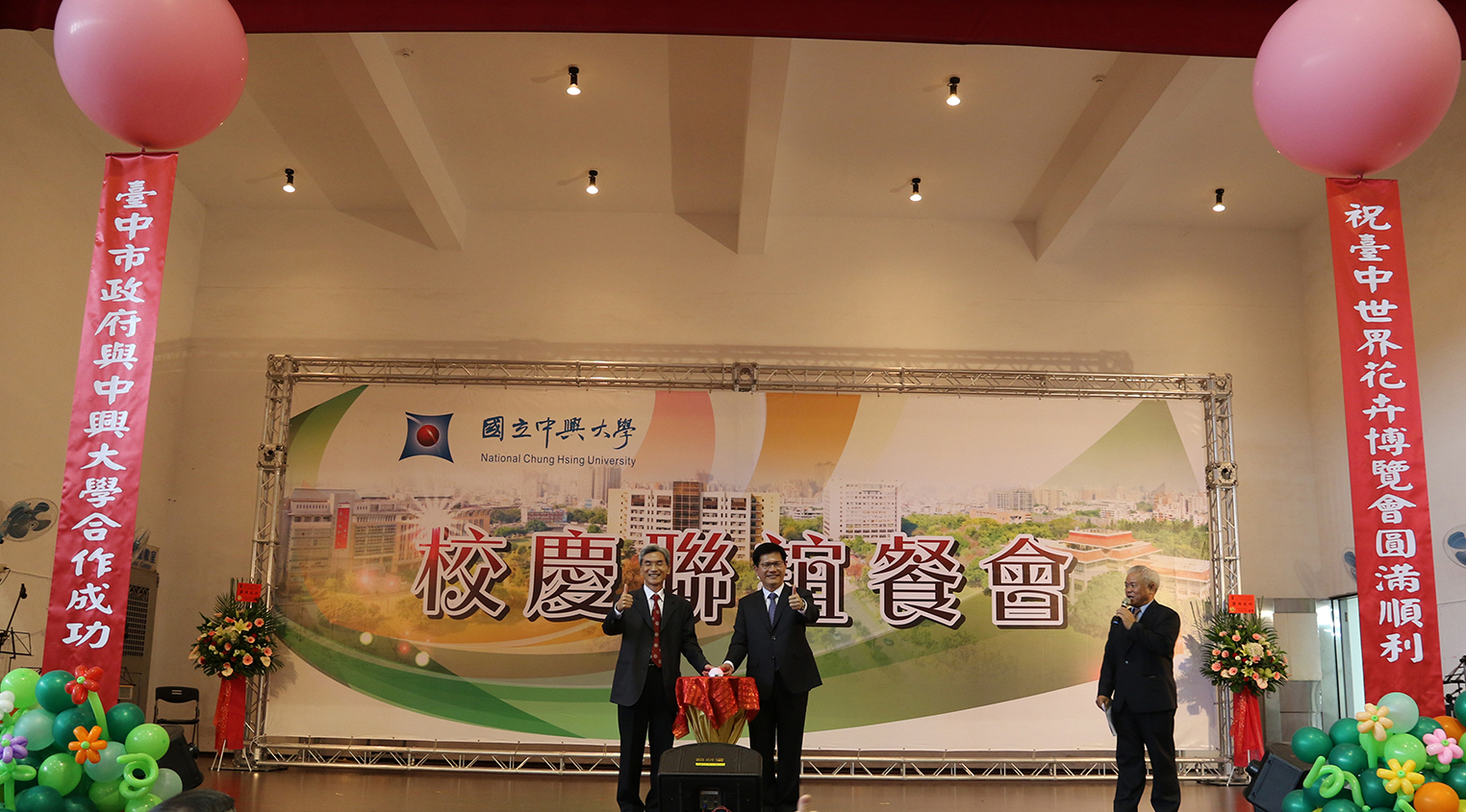 臺中市市長林佳龍也特地出席中午時段的興大校慶聯誼餐會,與興大校長薛富盛共同宣布「2018臺中世界花卉博覽會」雙方合作啟動,未來市府將結合在地,借重興大在園藝、農業領域的專長,共同投入臺中世界花博的規劃與推廣。