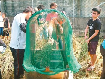 一百多名興大學生與外籍的交換學生分組以鐮刀收割,中午還堆疊收割後的稻草當作餐桌與椅子,在田野享用美味中餐、協助整理環境,體驗如何用機器脫穀、利用網狀工具篩穀,外籍交換生與台灣學生也彼此交流初體驗的心得。