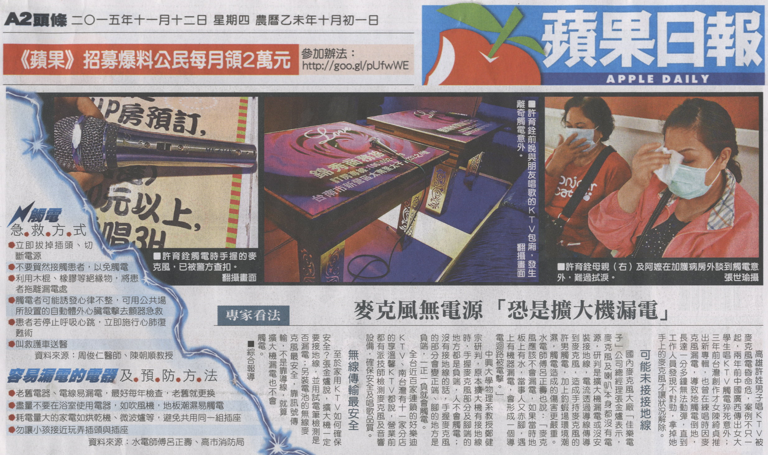 高雄許姓男子唱KTV被麥克風電昏命危,案例不只一起,兩年前中國廣西傳出女大學生唱KTV觸電猝死意外;三年前台灣創作才女陳綺貞推出新專輯,也曾在練唱時因麥克風漏電,導致她觸電倒地,長達一分多鐘無法動彈,直到工作人員發現不對勁,拿掉她手上的麥克風才讓狀況解除。