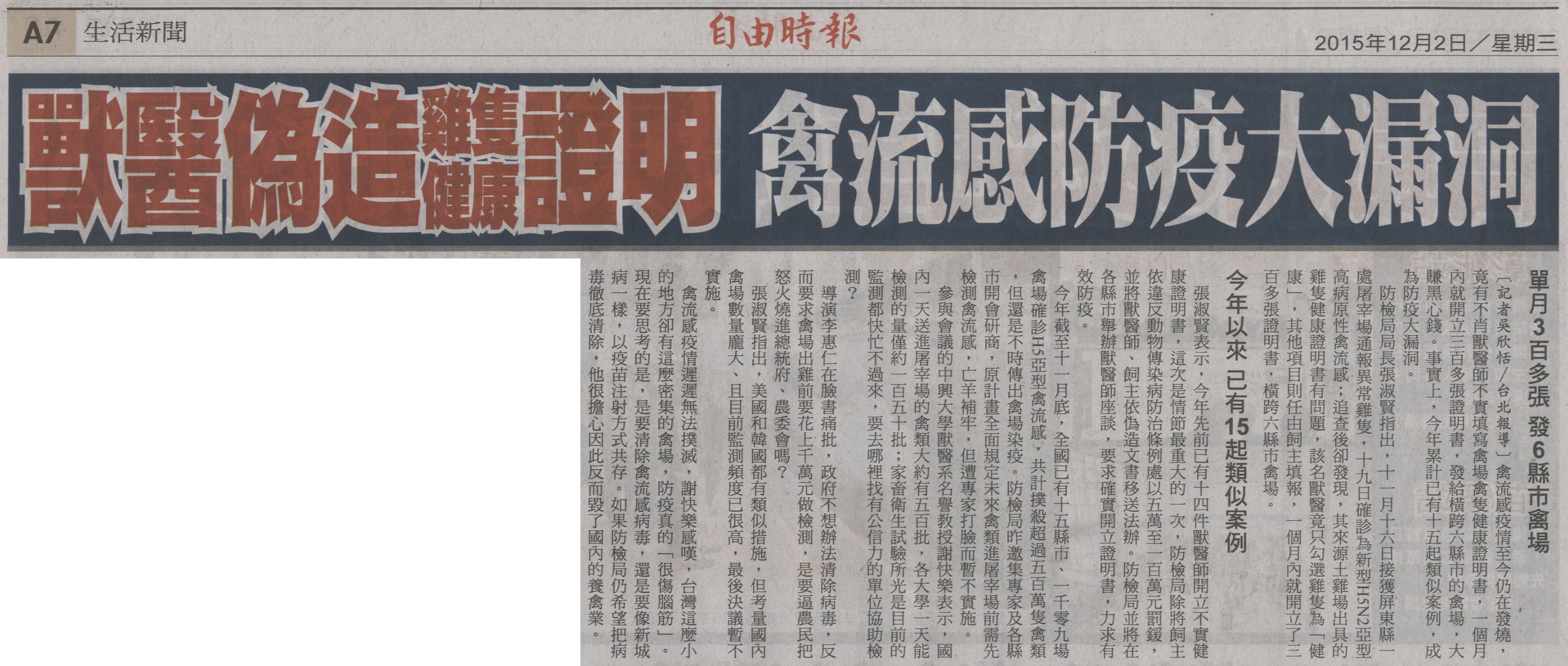 防檢局局長張淑賢指出,十一月十六日接獲屏東縣一處屠宰場通報異常雞隻,十九日確診為新型H5N2亞型高病原性禽流感;追查後卻發現,其來源土雞場出具的雞隻健康證明書有問題,該名獸醫竟只勾選雞隻為「健康」,其他項目則任由飼主填報,一個月內就開立了三百多張證明書,橫跨六縣市禽場。