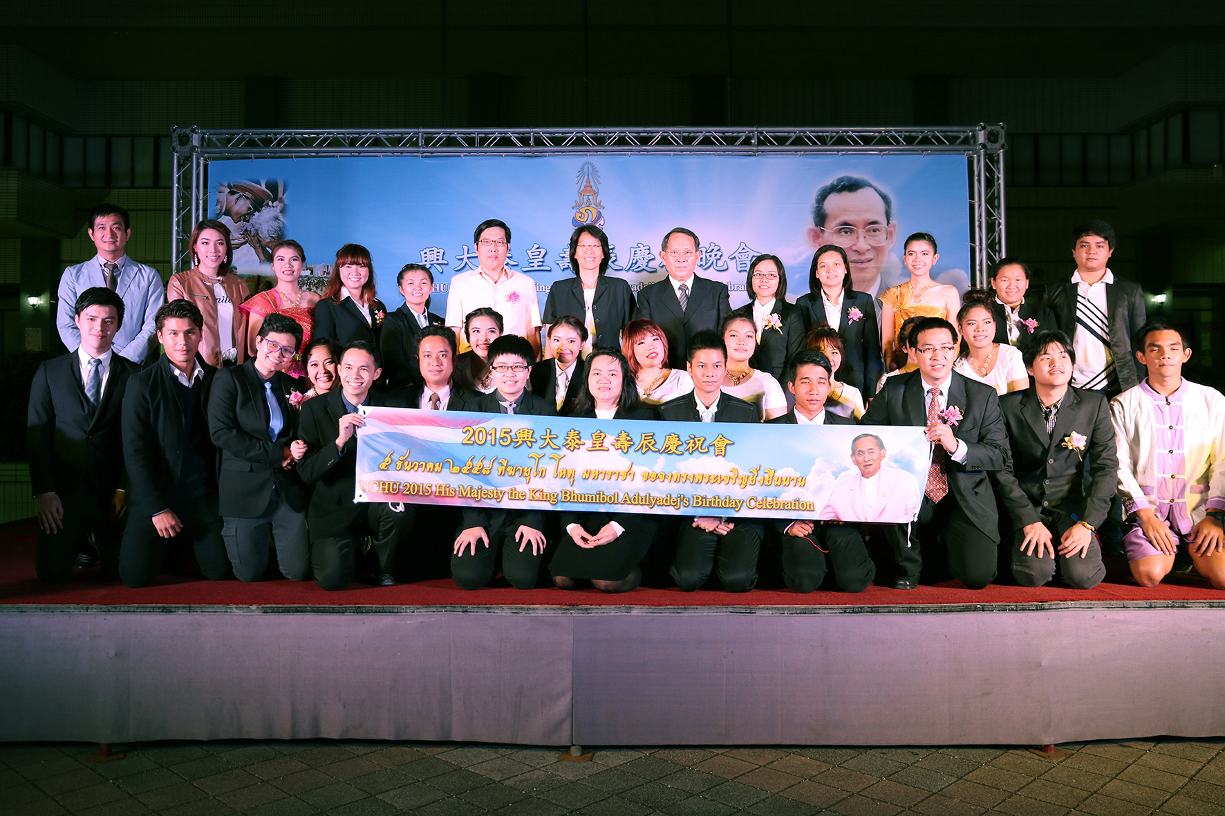 慶祝晚會中,準備了豐盛的泰式風味餐,並且播放泰皇介紹影片,讓與會學生了解泰皇任內的建設與貢獻,泰國學生穿上華麗的泰國傳統服飾,表演祈福舞蹈,泰生合唱團則獻唱泰皇創作的歌曲,向泰皇傳達崇高的敬意與祝福。晚會尾聲,進行燭火傳祝福活動,由興大退休老師楊耀祥教授代表祝禱祈福,並替泰生點燃燭火,台下師生一一點燃手中的燭火,點點燭光伴隨著泰語歌曲,眾人在祝福歌聲中度過美好的夜晚。