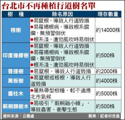 張郁慧說,黑板樹分散在各個幹道街區,砍除並非首選;另外,市府已增列卅九種適植路樹名單,並將黑板樹除名,未來不會再種。
