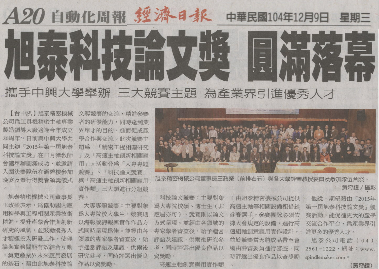 旭泰精密機械公司為工具機精密主軸專業製造領導大廠適逢今年成立20周年,日前與中興大學共同主辦「2015年第一屆旭泰科技論文獎」在日月潭教師會館舉辦圓滿成功,並邀請入圍決賽隊伍在涵碧樓參加晚宴及舉行得獎者頒獎儀式。