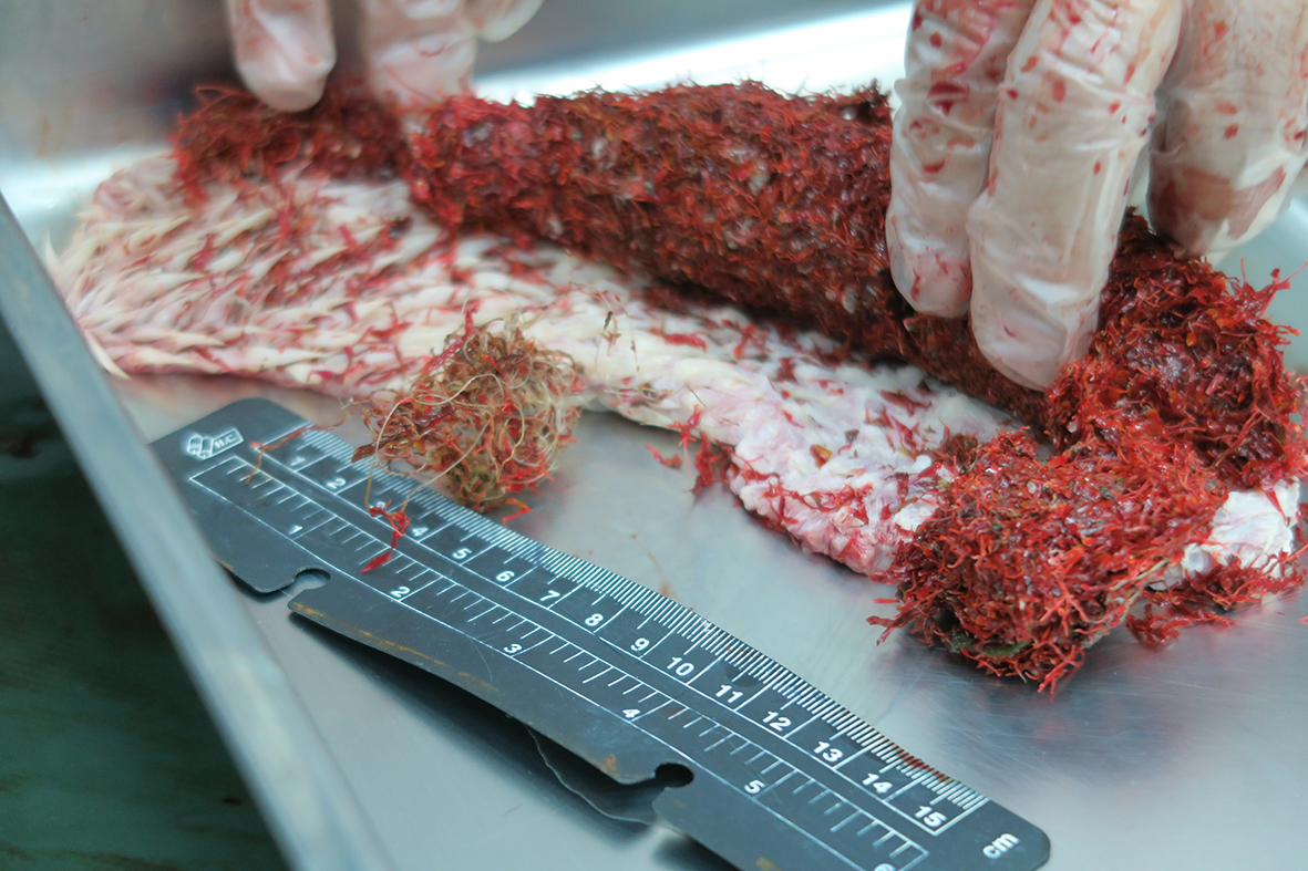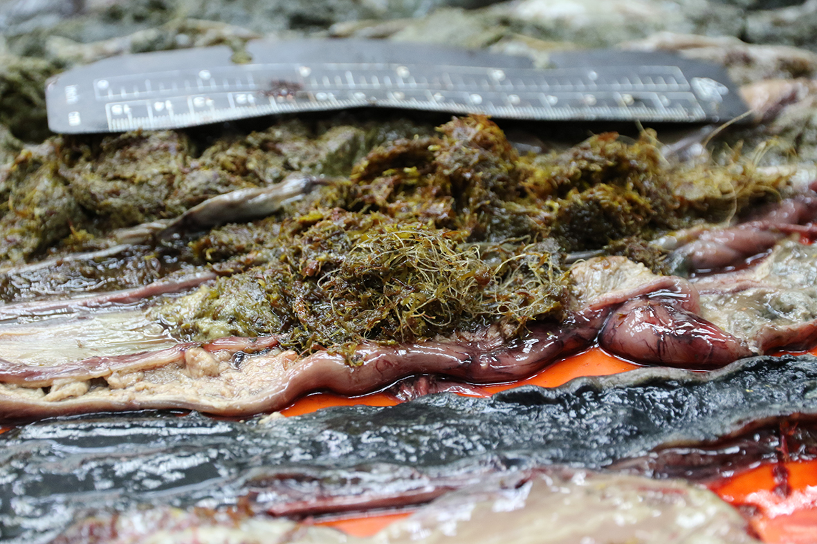 興大生科系吳聲海副教授(右)為綠蠵龜進行測量。 綠蠵龜食道裡的紅色海草中找到成團的漁網。 腸道裡也發現成團的漁網。