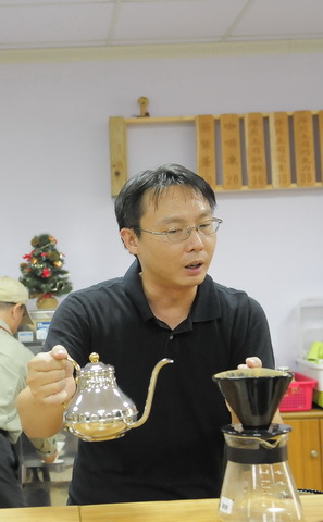 簡世昌博士示範手沖咖啡,喝出好味道。