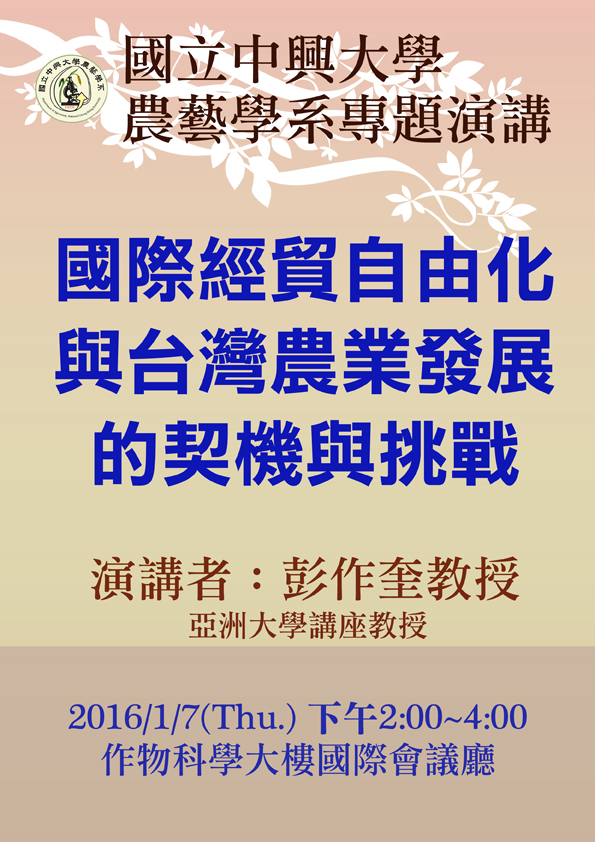 農藝系專題演講:[國際經貿自由化與台灣農業發展的契機與挑戰]