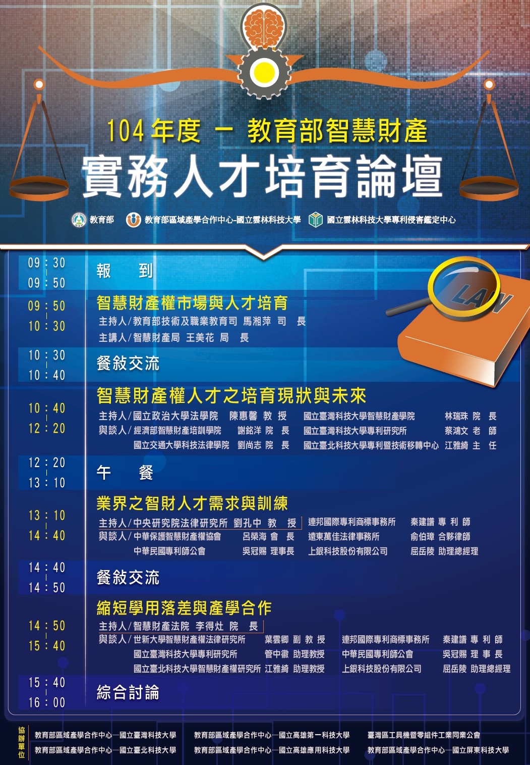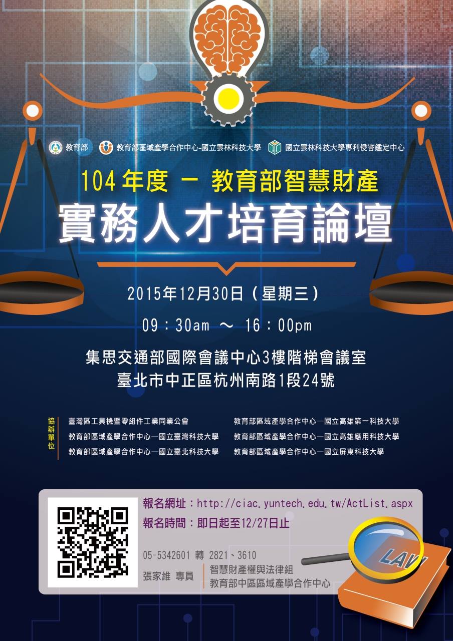 【轉知公告】『 104年度教育部智慧財產實務人才培育論壇』歡迎踴躍報告!!