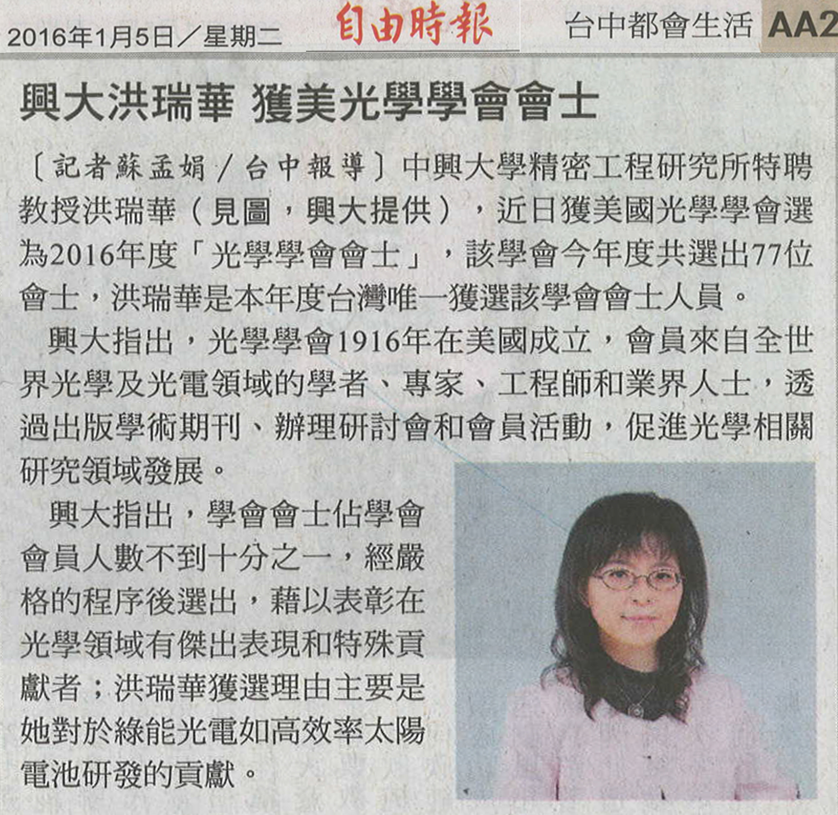 美國光學學會 (OSA)日前公布2016年度「光學學會會士」(OSA Fellow)當選名單,中興大學精密工程研究所洪瑞華特聘教授榮獲OSA Fellow殊榮,傑出學術成就備受肯定。本年度共選出77位會士,洪瑞華為本年度臺灣唯一獲選該學會會士人員。