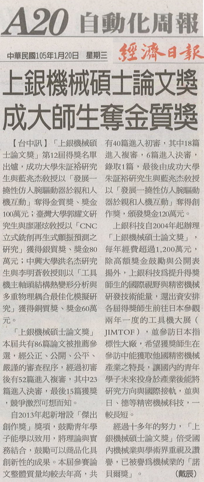 「上銀機械碩士論文獎」第12屆得獎名單出爐,成功大學朱証裕研究生與藍兆杰教授以「發展一撓性仿人腕驅動器於親和人機互動」奪得金質獎、獎金100萬元;臺灣大學郭耀文研究生與廖運炫教授以「CNC立式銑削再生式顫振預測之研究」獲得銀質獎、獎金80萬元;中興大學洪名杰研究生與李明蒼教授則以「工具機主軸頭結構熱變形分析與多重物理耦合最佳化模擬研究」獲得銅質獎、獎金60萬元。