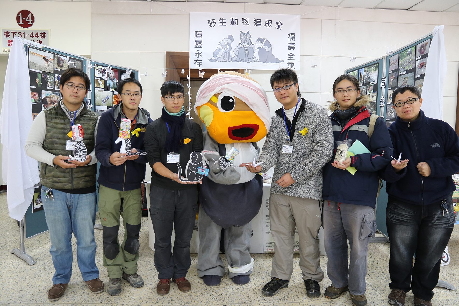 開幕式與會貴賓與參與人員大合影,前排右至左:興大林幸助教授、生科院陳鴻震院長、興大薛富盛校長、清華大學李家維教授、中研院生物多樣性研究中心邵廣昭執行長、特生中心方國運主任、林務局管立豪組長。 開幕演講主講人清大生科系教授李家維也是興大傑出校友,演講主題為「我們是地球的殺戮者,也該是守護者」。 會場外舉辦野生動物追思會,為各種因人類因素而死亡的野生動物哀悼與發聲。