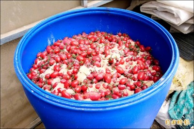 小蕃茄裂果太多,果農不得已製成酵素肥。(記者蔡宗勳攝)