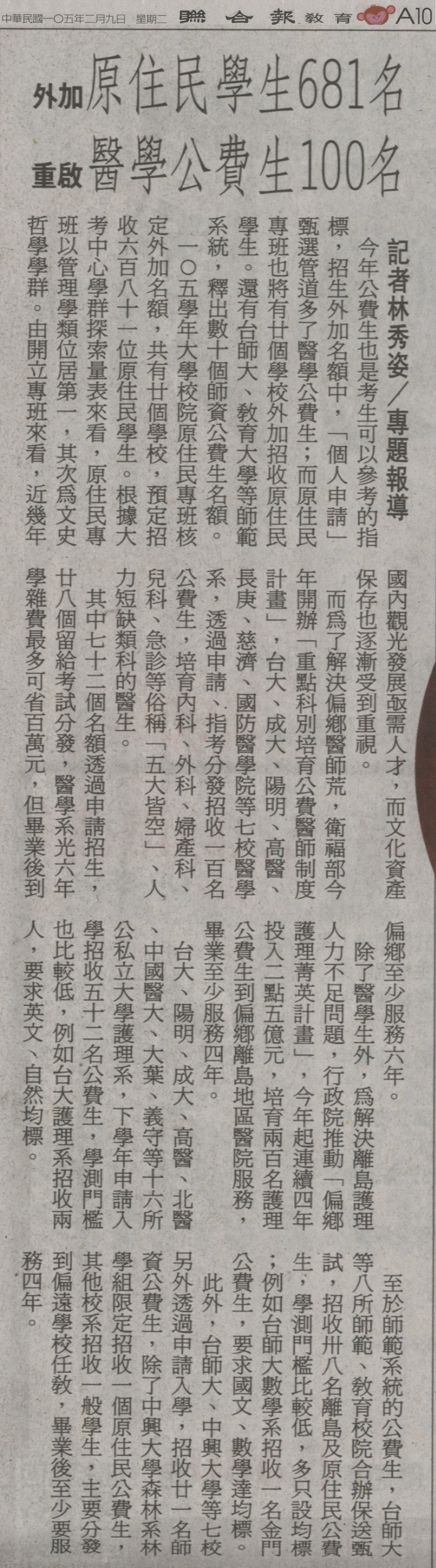 今年公費生也是考生可以參考的指標,招生外加名額中,「個人申請」甄選管道多了醫學公費生;而原住民專班也將有廿個學校外加招收原住民學生。還有台師大、教育大學等師範系統,釋出數十個師資公費生名額。