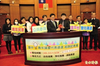 台中市今年8月要設立「青年議會」,3月先透過網路票選、自我推薦、學校推薦3種方式,選出63名、15歲至35歲設籍台中市的青年,首屆暫時1年一聘,將會修正為每屆任期4年。