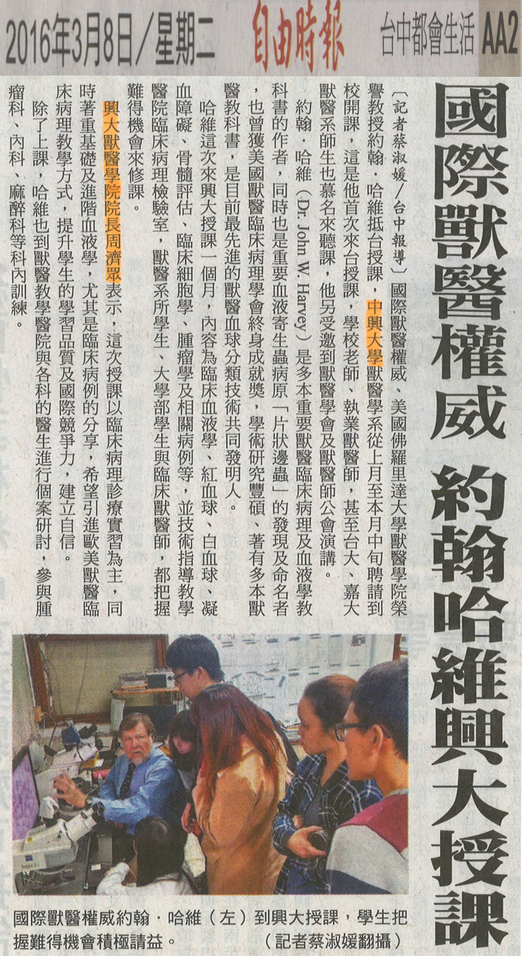 國立中興大學獸醫學系近期聘請了美國佛羅里達大學獸醫學院榮譽教授約翰‧哈維到校開課。約翰‧哈維是多本重要獸醫臨床病理及血液學教科書的作者,同時也是重要血液寄生蟲病源「片狀邊蟲」的發現及命名者,這是他首次來台授課,除在興大開課外,也受邀至獸醫學會及獸醫師公會演講。