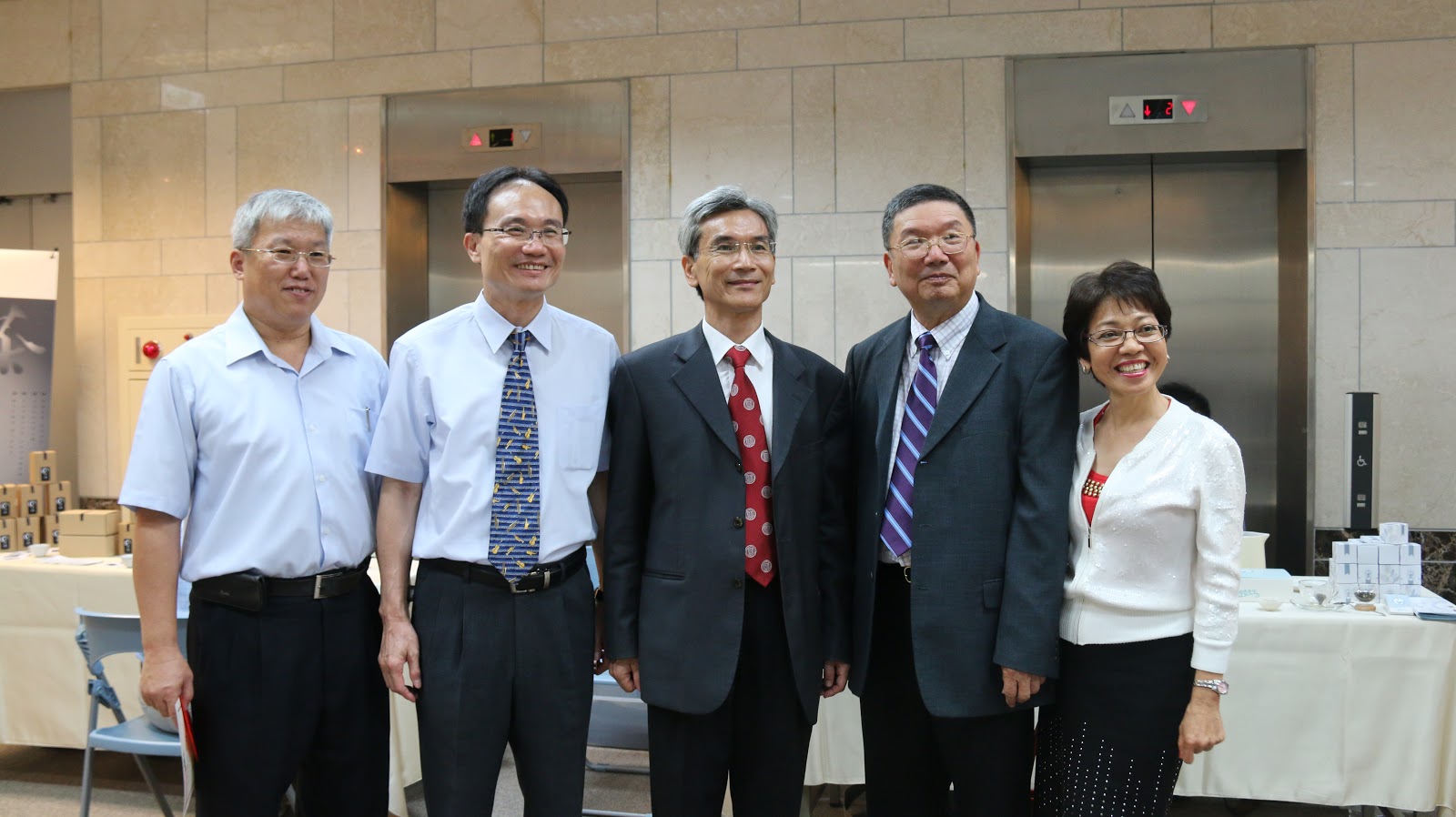 興大校長薛富盛(中)、農資院副院長申雍(最左)與睿茶平臺執行團隊的老師們參加成果發表。 攝影/蘇楚婷 |