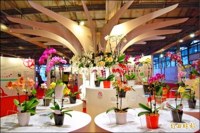 台灣蘭展的「大數據時代之蘭花生技專區」展出基改新品種,後方的造型柱子象徵電腦的CPU。(記者楊金城攝)