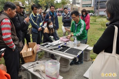 台南社區大學與兒童科學館、中興大學合作推廣土壤資源教育,到台南公園實地檢測。(記者洪瑞琴攝)