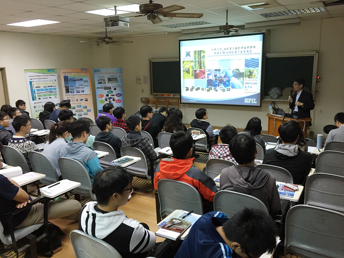 興大化工系與矽品精密聯合規劃的「進階電子構裝理論與實務」學分課程,由竇維平教授開課。矽品藍章益處長介紹封測產業。