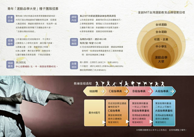 2.參與「極拳道種子教練」學員,將由本院提供100位免費培訓名額,於課程結束後經鑑定合格後,並發派至鄰近國小擔任指導教練。