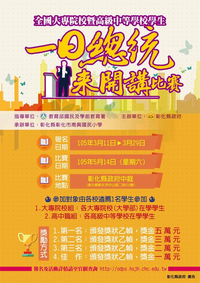 全國大專院校暨高級中等學校生生「一日總統來開講」比賽(報名至3/29截止)