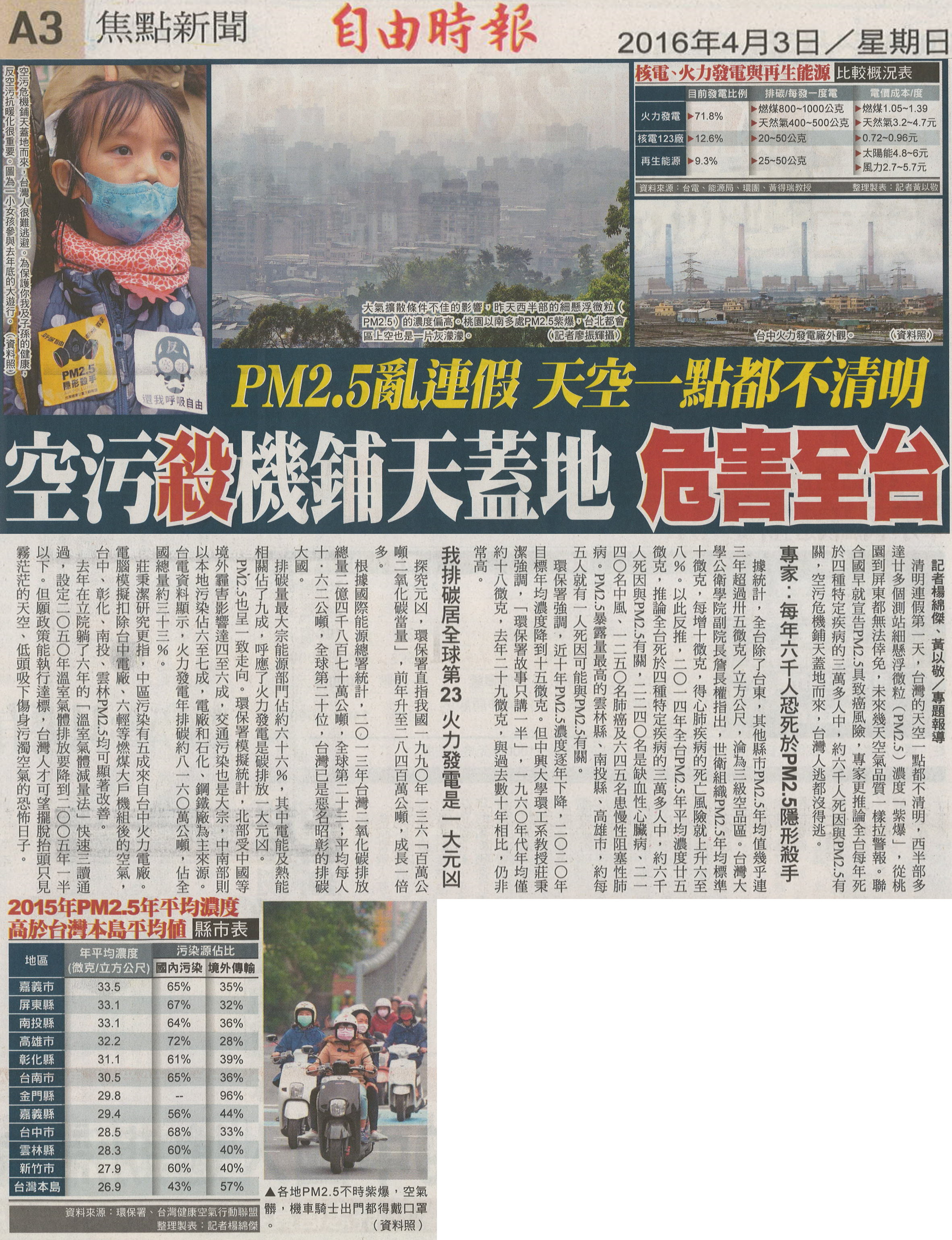 清明連假第一天,台灣的天空一點都不清明,西半部多達廿多個測站細懸浮微粒(PM2.5)濃度「紫爆」,從桃園到屏東都無法倖免,未來幾天空氣品質一樣拉警報。聯合國早就宣告PM2.5具致癌風險,專家更推論全台每年死於四種特定疾病的三萬多人中,約六千人死因與PM2.5有關,空污危機鋪天蓋地而來,台灣人逃都沒得逃。