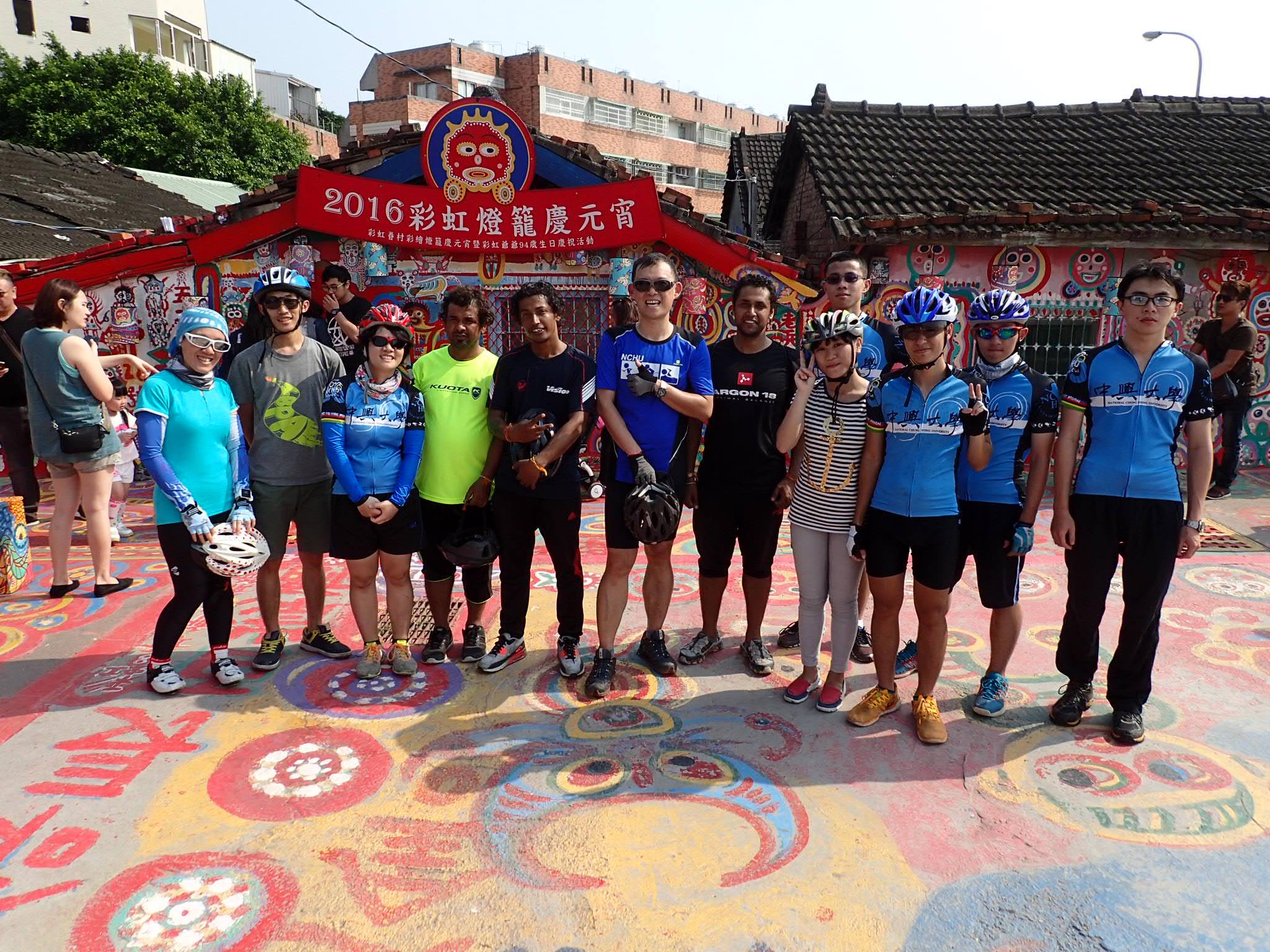 興大國政所長陳牧民(中)帶領興大師生響應由Ajit_Baral(左2)、Amrit_Baral(右1)、Shankar_Poudel(右2)發起的單車環球活動。 興大10位師生響應三位尼泊爾青年所發起的單車環球活動。 參觀彩虹眷村。