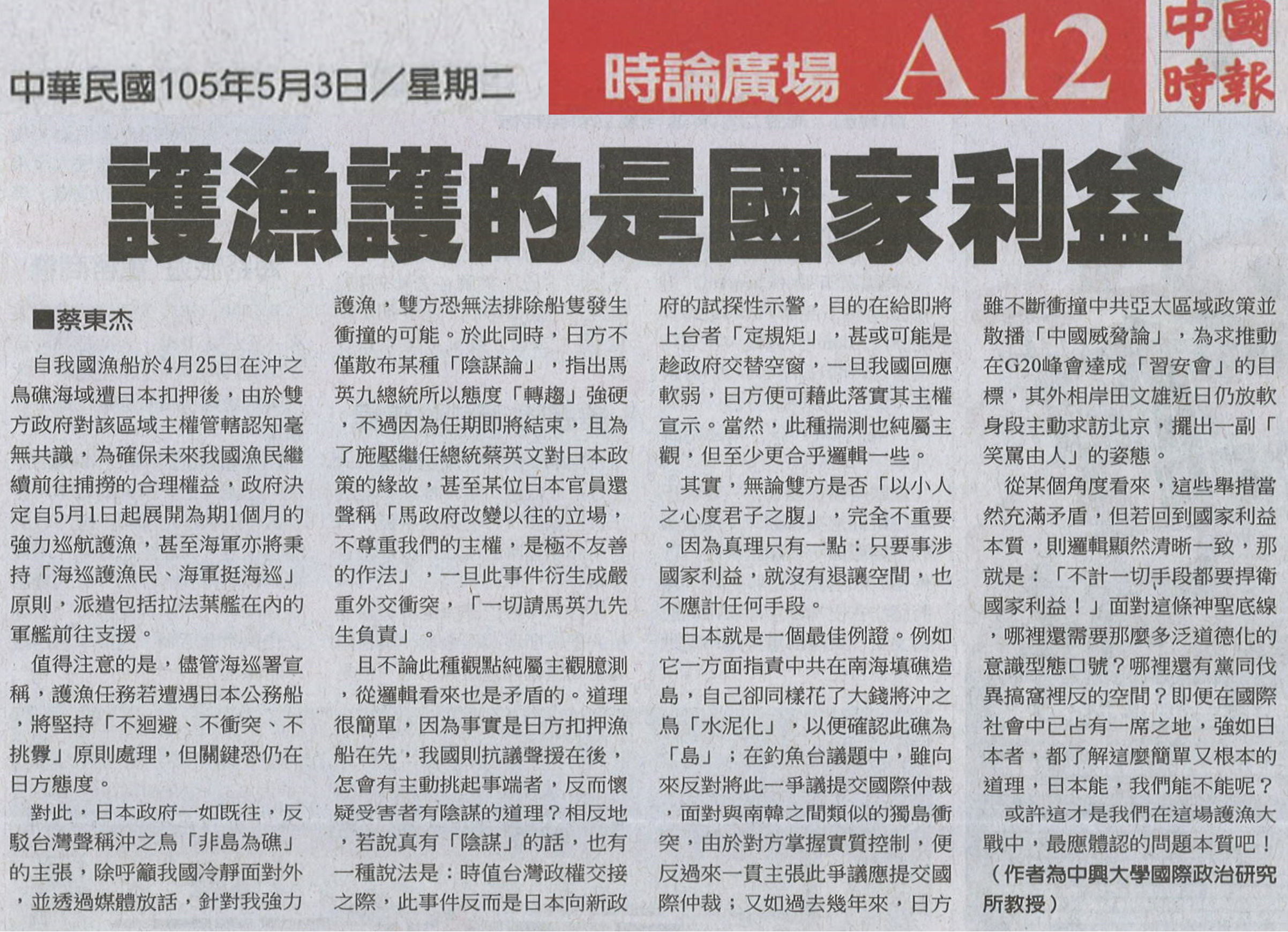 稿源:2016-05-03/中國時報/A12/中興大學國際政治研究所教授/蔡東杰