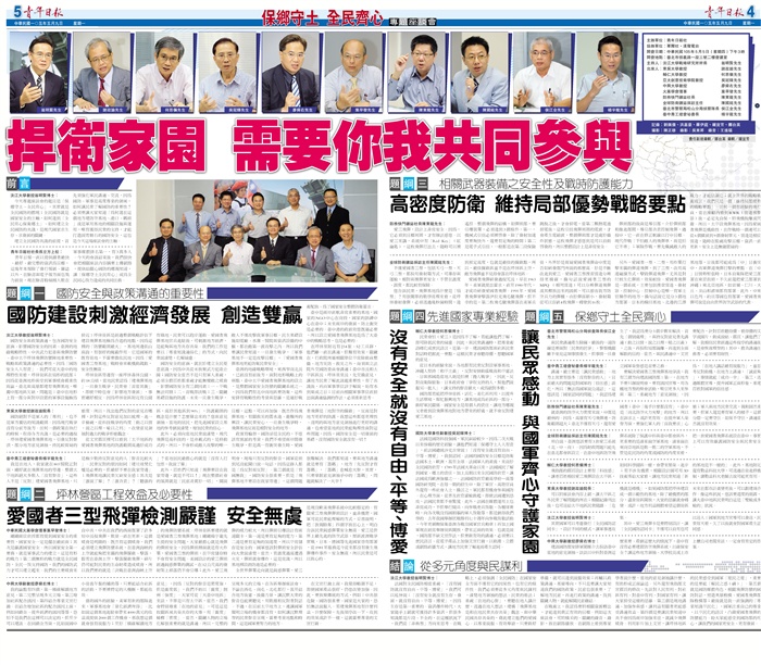 青年日報一直以提供讀者最快、最好、最完整的資訊為目標,這幾年本報除了發行報紙、雜誌以外,在臉書與電子報方面也戮力經營,現在臉書粉絲團人數在軍事媒體排名第一,有3萬多人。今天的會議結束後,我們很快會把相關座談內容摘要上傳網路,提供給關心國防的鄉親知道,讓「保鄉守土全民齊心」成為全民同心致力達成的共同任務。