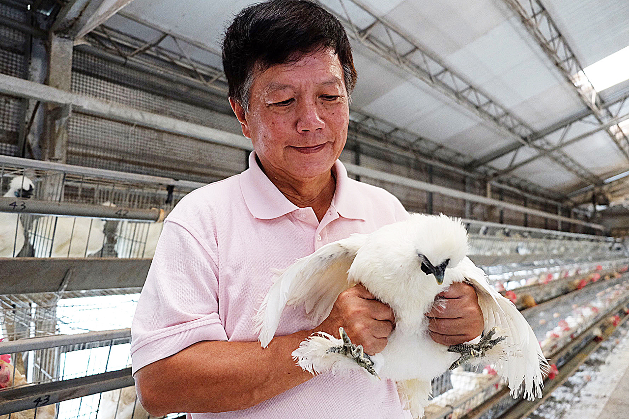 興大保存台灣土雞,也會保存其他國家的特色土雞,李淵百手上抓的絲羽烏骨雞是1993年從中國引進。(攝影/郭琇真) |