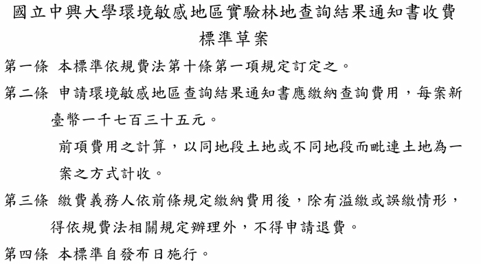 國立中興大學環境敏感地區實驗林地查詢結果通知書收費標準草案公告