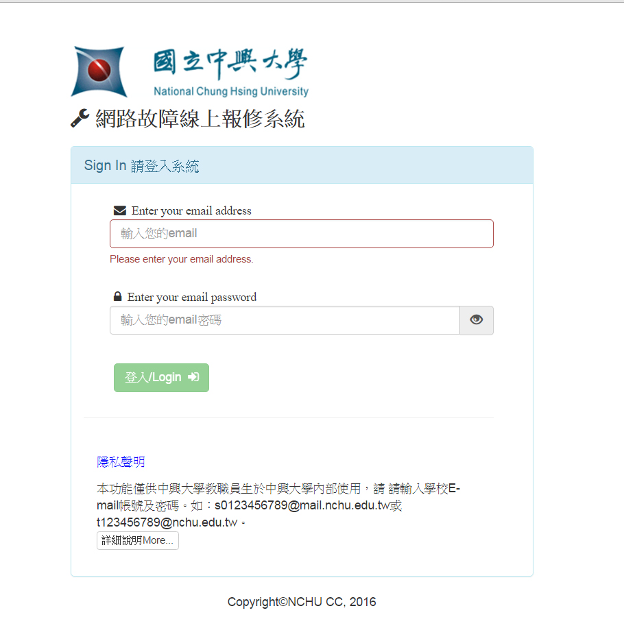 歡迎本校教職員工生發現網路有狀況時, 可以到http://netcc.nchu.edu.tw/sys/repair 填寫報修單,
