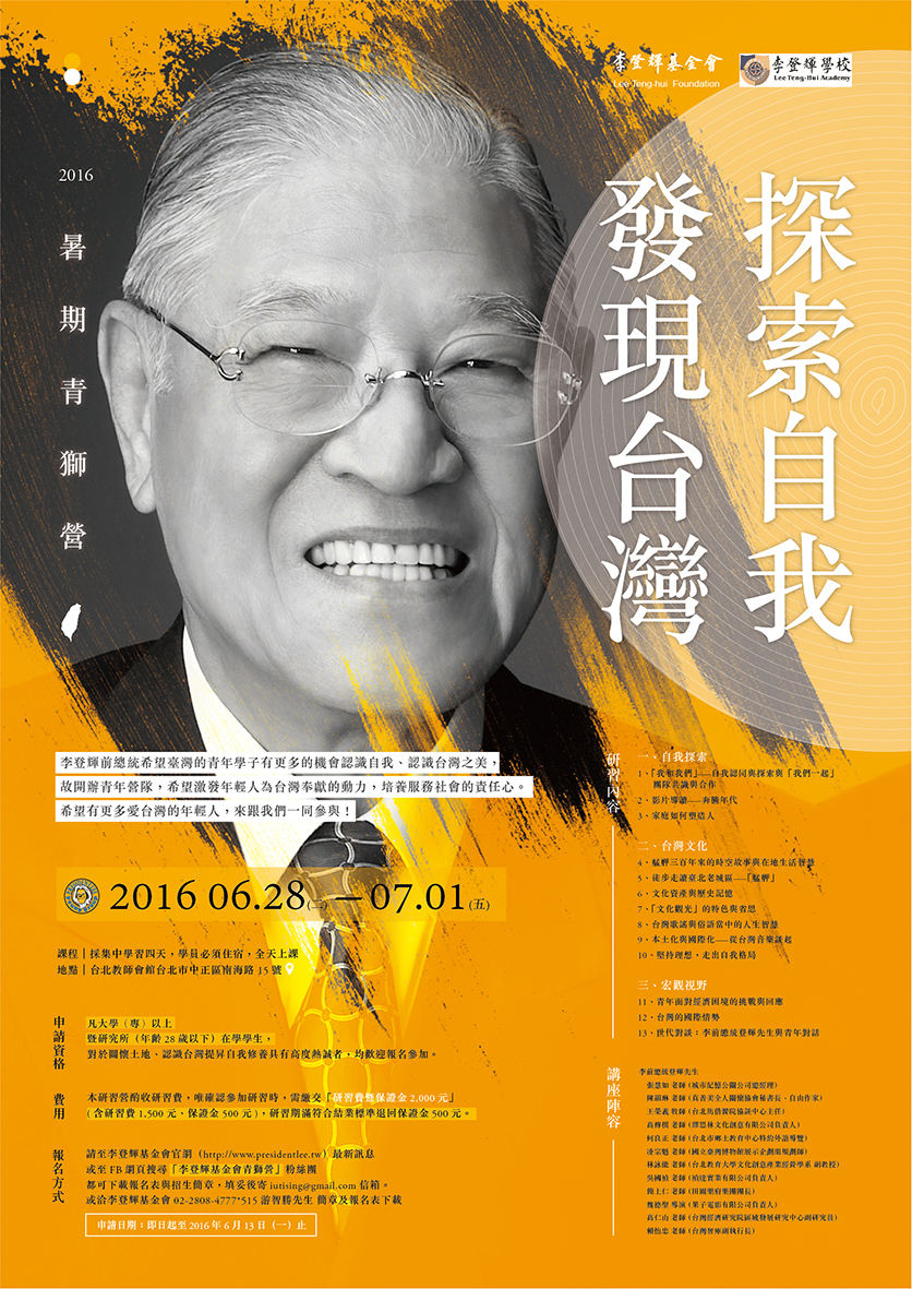 李登輝基金會大專院校青年營隊「2016暑期青獅營」即日起開始接受報名!