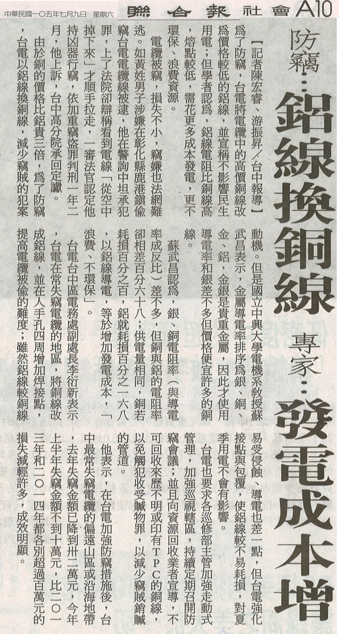 為了防竊,台電將電纜中的高價銅線改為價格較低的鋁線,並宣稱不影響民生用電;但學者認為,鋁線電阻比銅線高,熔點較低,需花更多成本發電,更不環保、浪費資源。