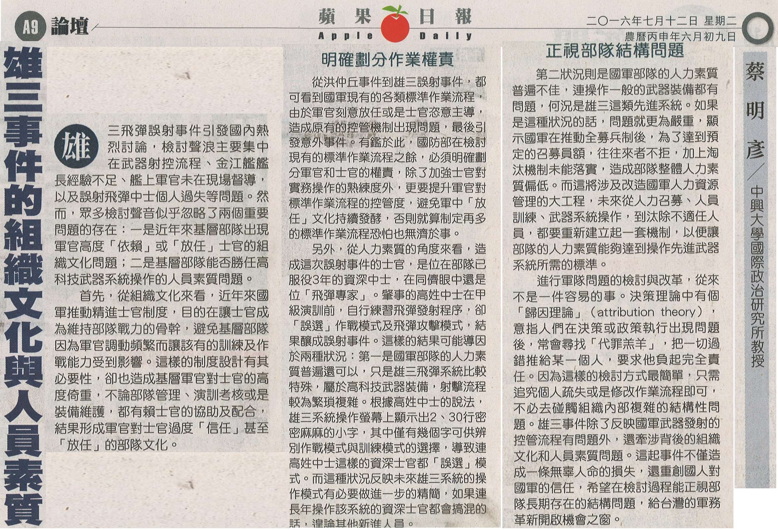 稿源:2016-07-12/蘋果日報/A9//蔡明彥