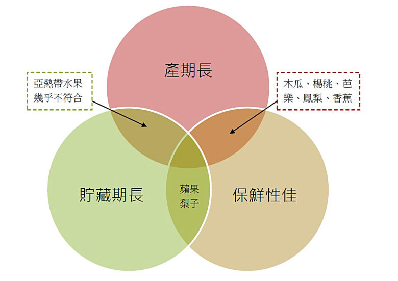 謝慶昌說,適合外銷的水果須符合產期長、貯藏期長、保鮮性加三要素。(資料提供/謝慶昌,製圖/郭琇真) |