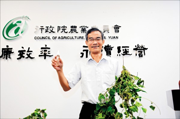 中興大學森林系教授兼系主任盧崑宗將小花蔓澤蘭製成醋液,可有效防治小黑蚊。(農委會提供)