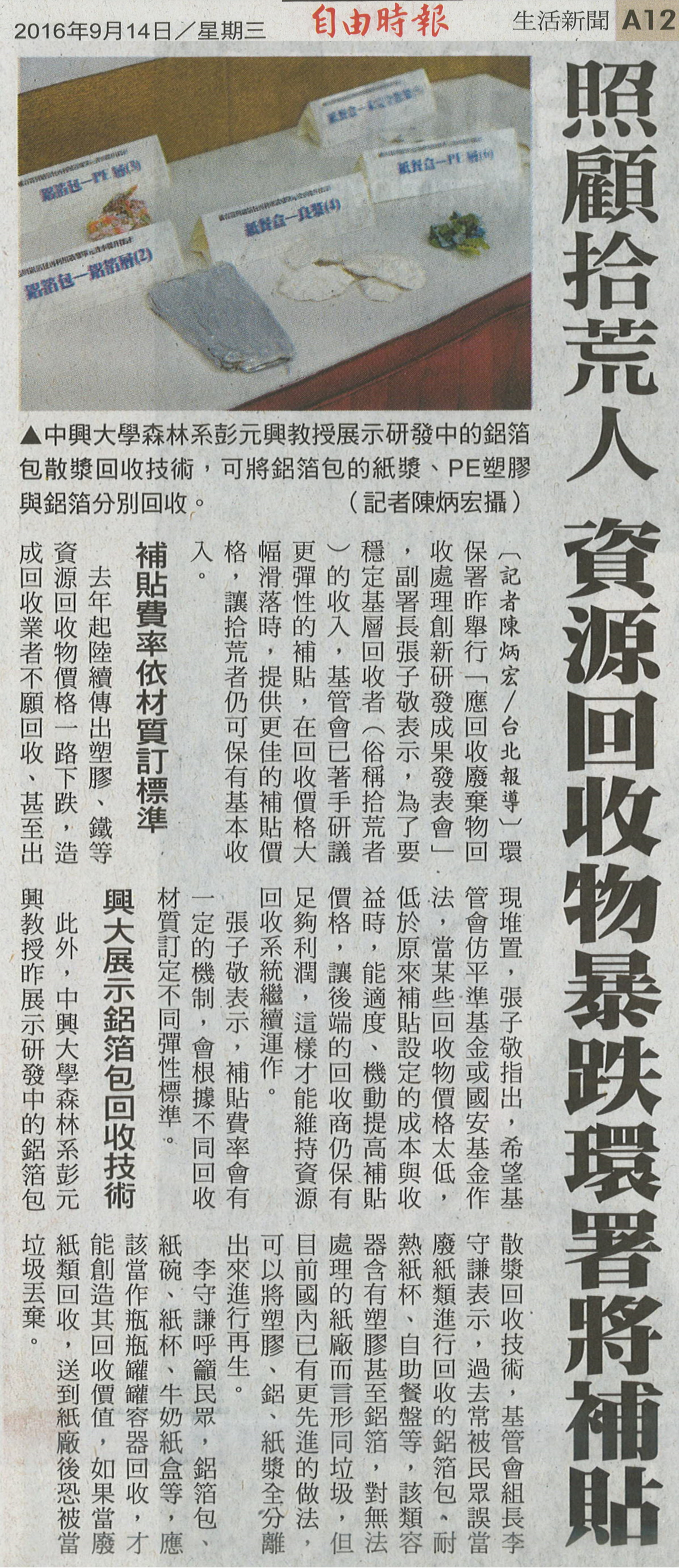 此外,中興大學森林系彭元興教授昨展示研發中的鋁箔包散漿回收技術,基管會組長李守謙表示,過去常被民眾誤當廢紙類進行回收的鋁箔包、耐熱紙杯、自助餐盤等,該類容器含有塑膠甚至鋁箔,對無法處理的紙廠而言形同垃圾,但目前國內已有更先進的做法,可以將塑膠、鋁、紙漿全分離出來進行再生。