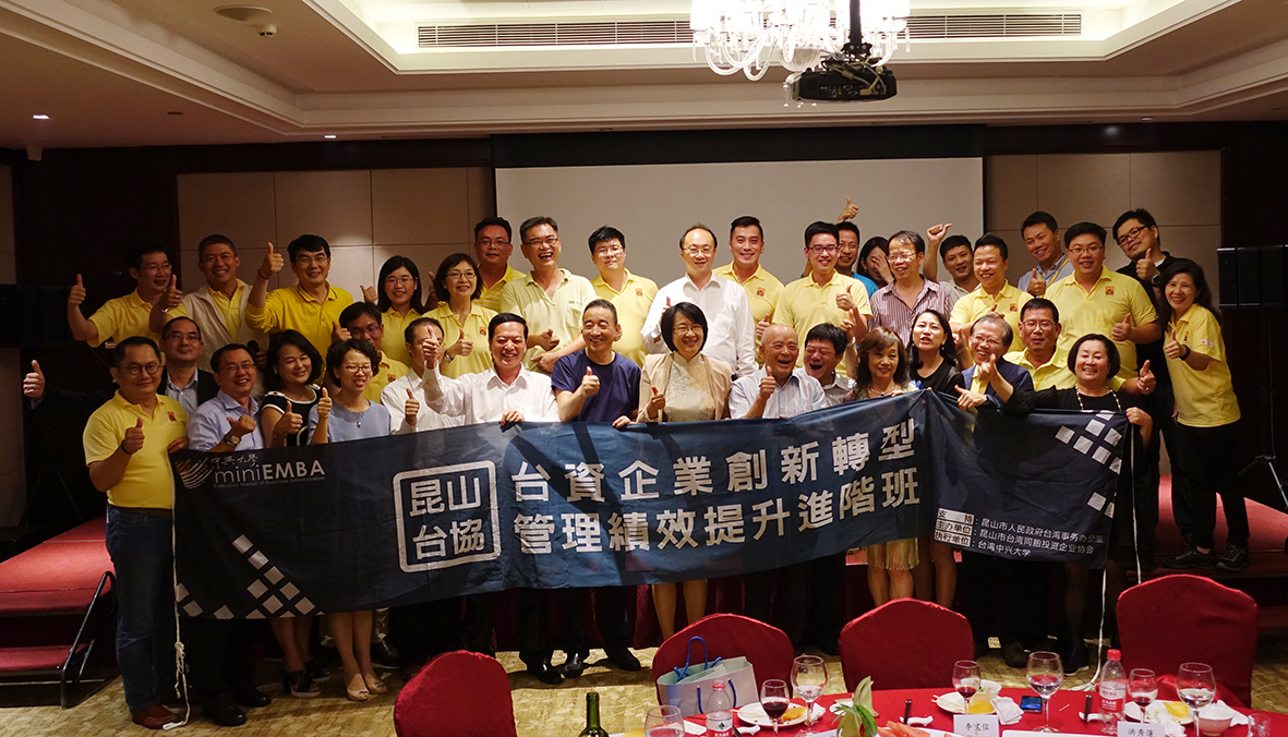 中興大學創新產業推廣學院與昆山市臺灣同胞投資企業協會 (簡稱昆山市台協),針對昆山台商企業的高階主管,於6月25日開設「2016昆山市台資企業創新轉型管理績效提升進階班」課程。課程於9月25日舉辦結業考核競賽與企業參訪,邀請昆山市金銘副市長(偕李文書記、張晶副書記、高苡平鎮長)等人、昆山台辦張琴副主任、昆山台協李寬信會長(偕廖萬國監事長、林國銓常務副會長、宗緒惠常務副會長、吳明祥委員會會長)等人、昆山一期學長姐及台商企業的高階主管響應參與。