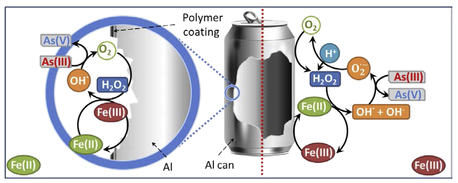 此次研究利用鋁金屬在酸性條件下的類芬頓反應,所產生的強氧化劑,將毒性較強的三價砷氧化成毒性較低的五價砷,此反應的產物鐵、鋁離子及五價砷,可藉由酸鹼值的調整至中性,產生氫氧化鐵與氫氧化鋁來吸附並移除五價砷,可有效降低水中砷的濃度。