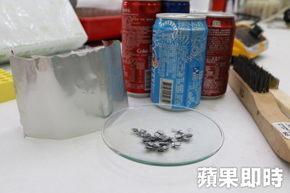 鄒裕民說,民眾隨手丟棄的各式飲料鋁罐,其實零價鋁含量多達九十%以上,等於是純鋁金屬,磨除鋁罐表面的有機聚合物後,將鋁片剪成小碎片後即可利用。