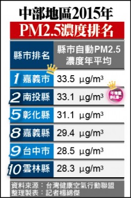 中部地區2015年PM2.5濃度排名(記者楊綿傑製表)