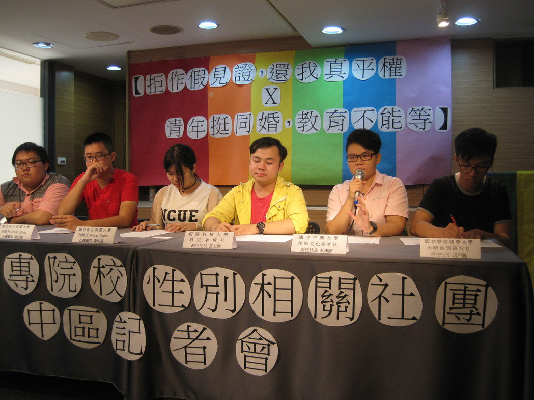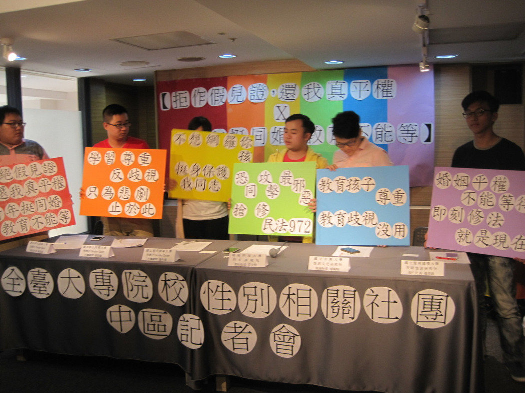 全台各大專院校性別相關社團成員今天挺婚姻平權和同志婚姻問題,中部學生性別社團聯盟今天上午在台中市開記者會,要求「拒作見證,還我真平權,青年挺同婚,教育不能等」。
