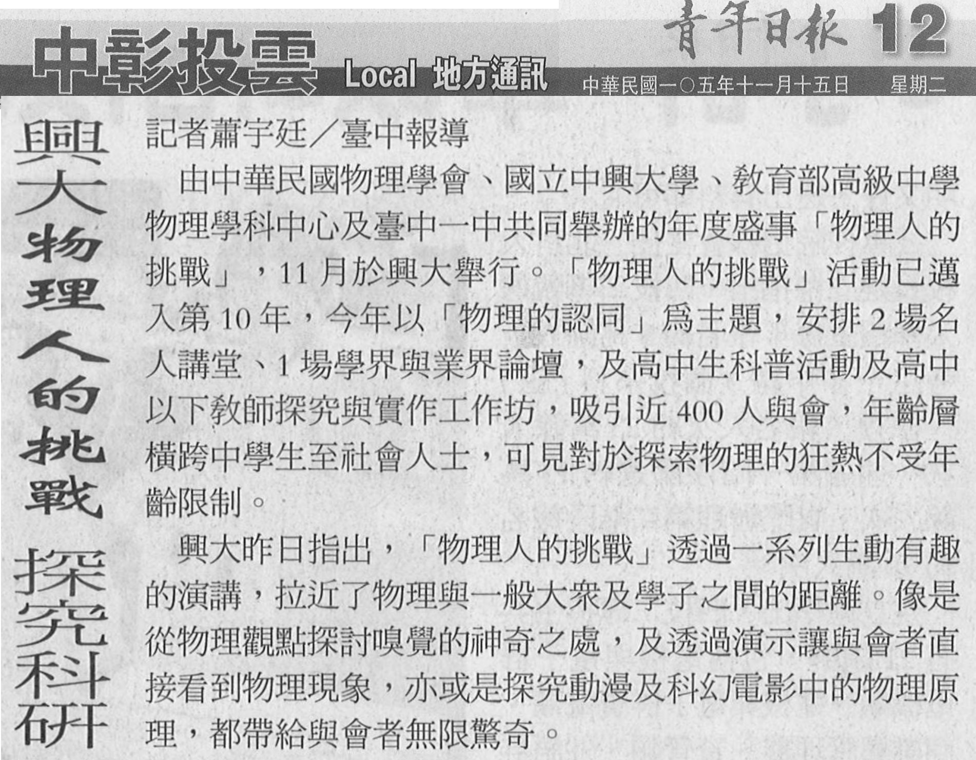 【媒體報導】興大「物理人的挑戰」 探究科研