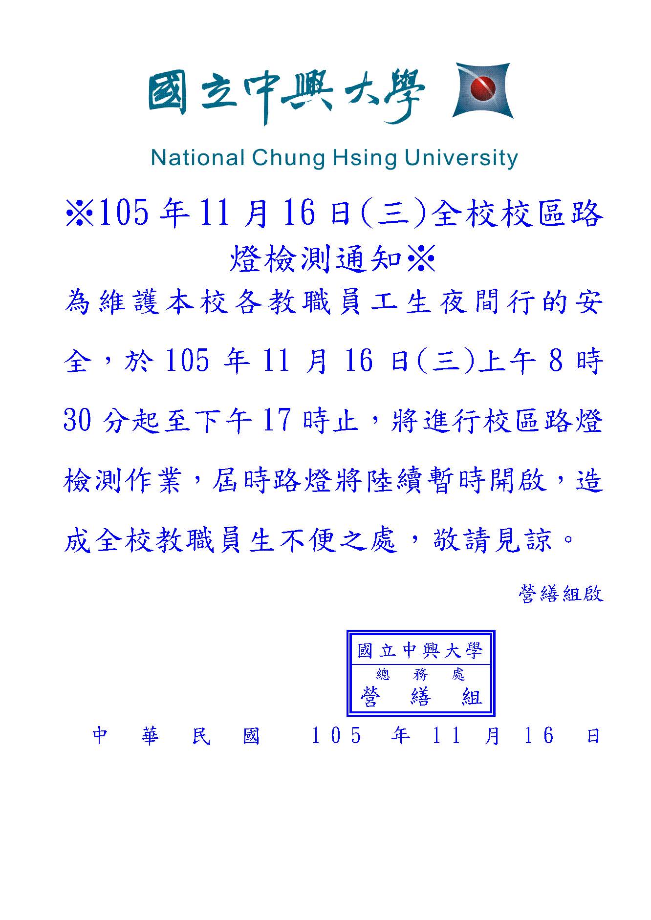 【營繕組緊急通知】※105年11月16日(三)全校校區路燈檢測通知※