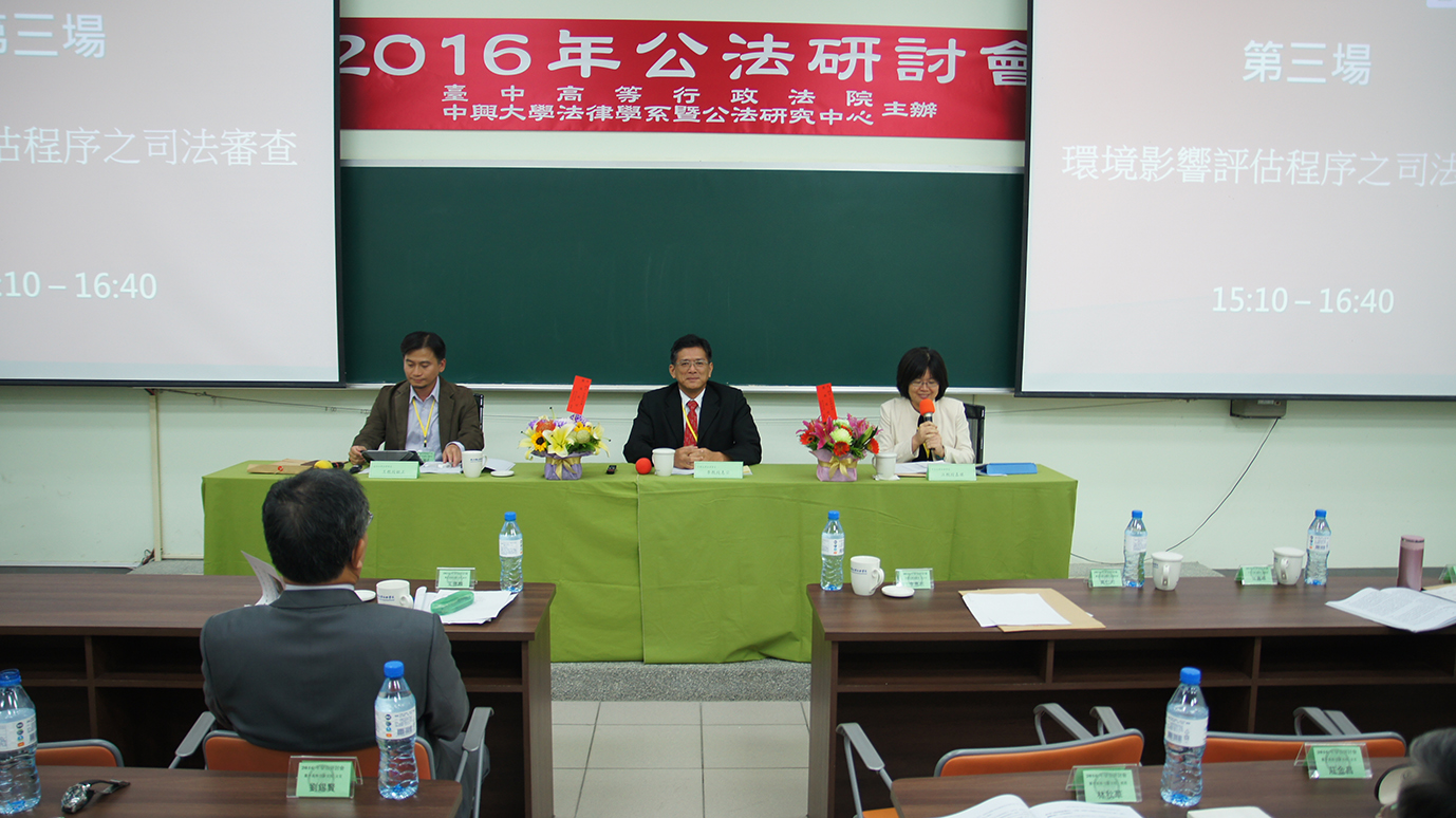 第3場由中興大學李惠宗主任主持,成功大學王毓正副教授發表「環境影響評估程序之司法審查」,中正大學江嘉琪副教授與談。王副教授探討環評主管機關作成「有條件通過環境影響評估審查」,而以附款取代「對環境有重大影響之虞」之法律構成要件審查是否適法,並指出最高行政法院102年度判字第70號判決意旨,已成為行政法院審查環評結論附款合法性的重要判斷依據。但自該號判決以來,環評實務所堅守的「在欠缺許可所必須具備之法定基本構成要件時,尚不得基於附款之確保而為許可」認定,未必符合行政程序法第93條第1項後段所定「為確保行政處分法定要件之履行而以該要件為附款內容」之規定。